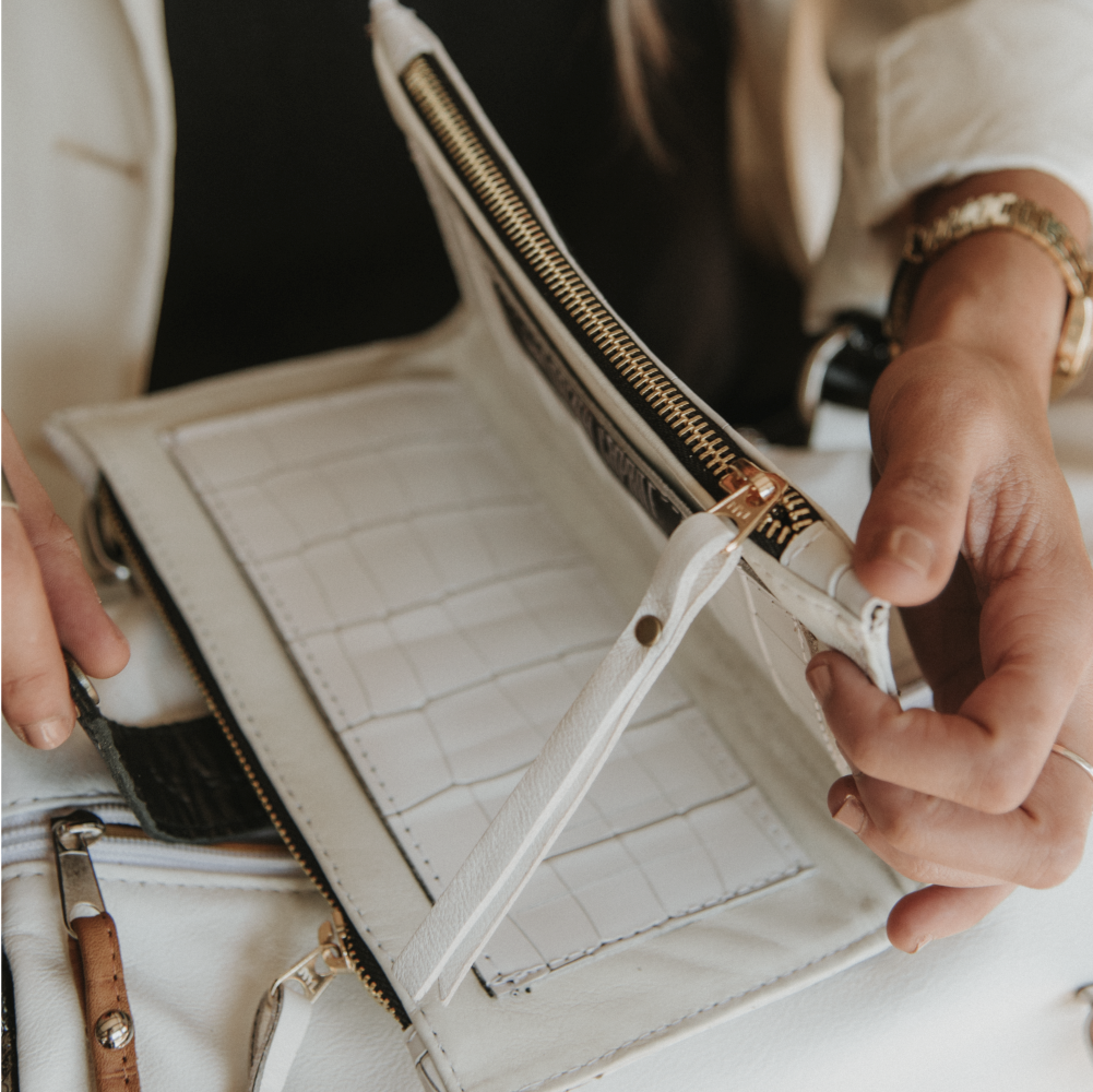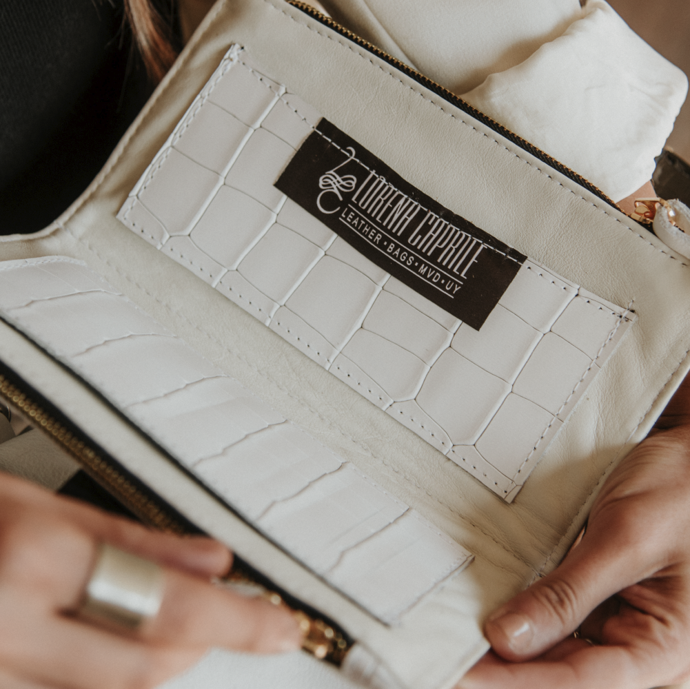 Billetera confeccionada en cueros de excelente calidad. Tiene bolsillo en el frente, 2 bolsillos con cierre a sus extremos y dos bolsillos para tarjetas en su interior.